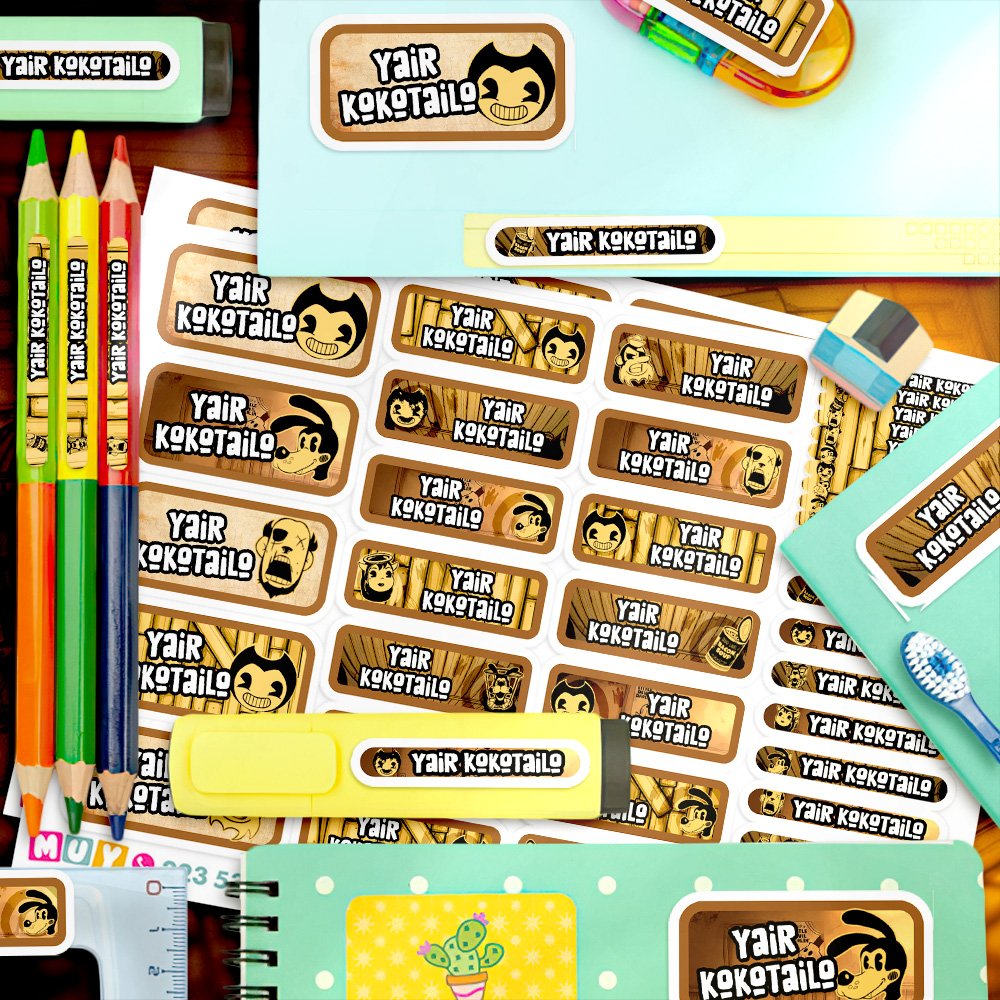 Sumergite en el mundo de tinta y pesadillas con estas etiquetas de Bendy and the Ink Machine, el clásico indie horror que mezcla animación de los años 30 con misterio, aventura y criaturas de tinta viviente. Ideales para identificar cuadernos, libros, mochilas, cartucheras y loncheras, personalizadas con tu nombre en un diseño retro que captura la estética noir, los personajes como Bendy, Boris el Lobo de Caricatura y el ambiente oscuro del estudio de Joey Drew.